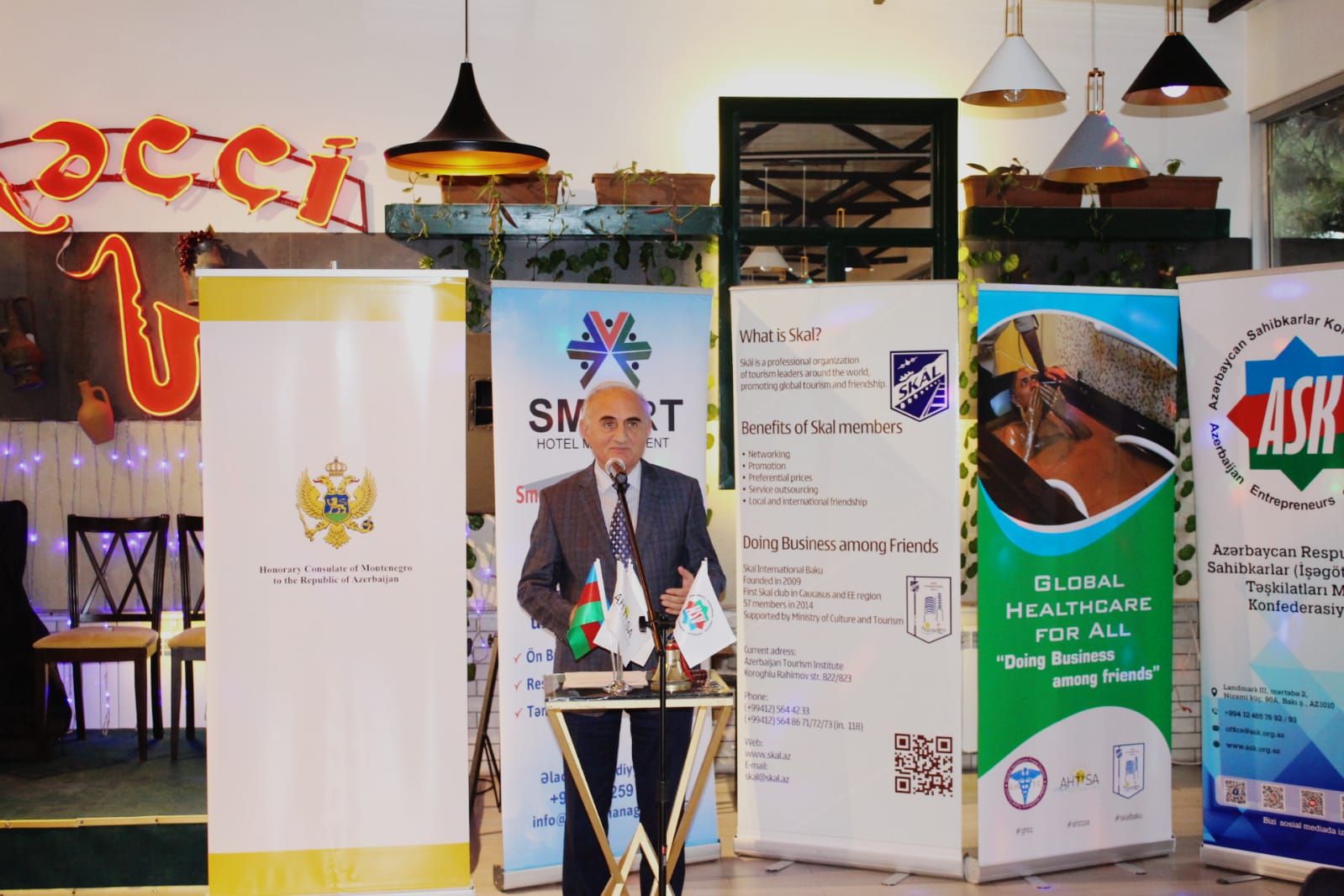 El Presidente de Skål International Baku, el Sr. Jeyhun Ashurov, señaló en su discurso que Skål International reúne a más de 13.000 profesionales de 311 Clubes que operan en 85 países del mundo. Ha señalado que la organización que dirige es el primer y único club establecido en la CEI (Comunidad de Estados Independientes). Jeyhun Ashurov señaló también que esta reunión se celebraba en el marco de la Semana Global del Emprendimiento. Según él, cada año, desde 2008, la tercera semana de noviembre se designa como la Semana Global del Emprendimiento en todo el mundo: "El espíritu emprendedor es un tipo de actividad que crea valor. Los emprendedores son personas que saben afrontar cualquier situación. El espíritu empresarial crea puestos de trabajo, promueve la estabilidad y la prosperidad”. La Confederación de Empresarios de la República de Azerbaiyán lleva funcionando en Azerbaiyán desde 1999. En la actualidad, la Confederación de Empresarios de Azerbaiyán cuenta con unas 6.000 entidades empresariales, incluidos unos 70 miembros asociados.